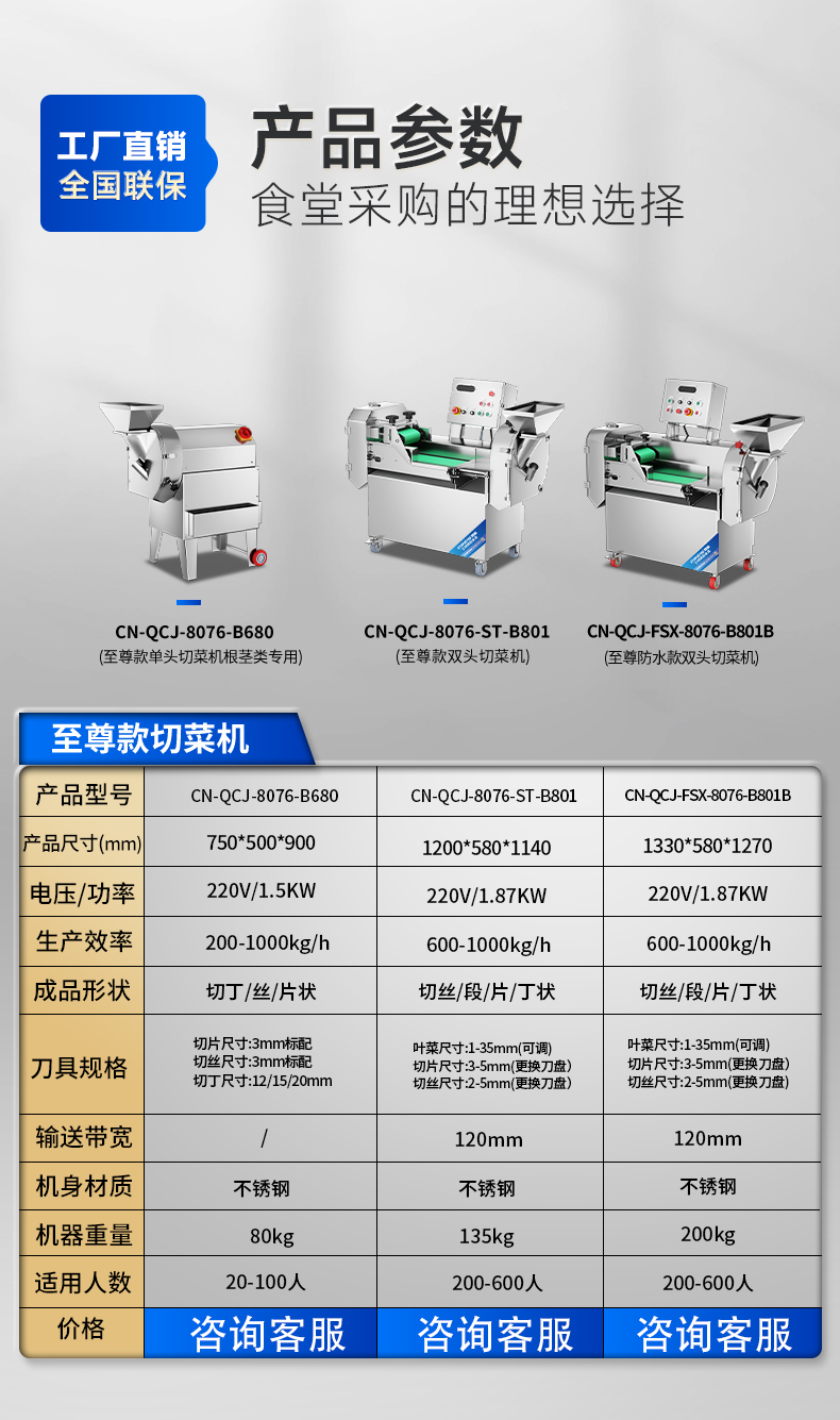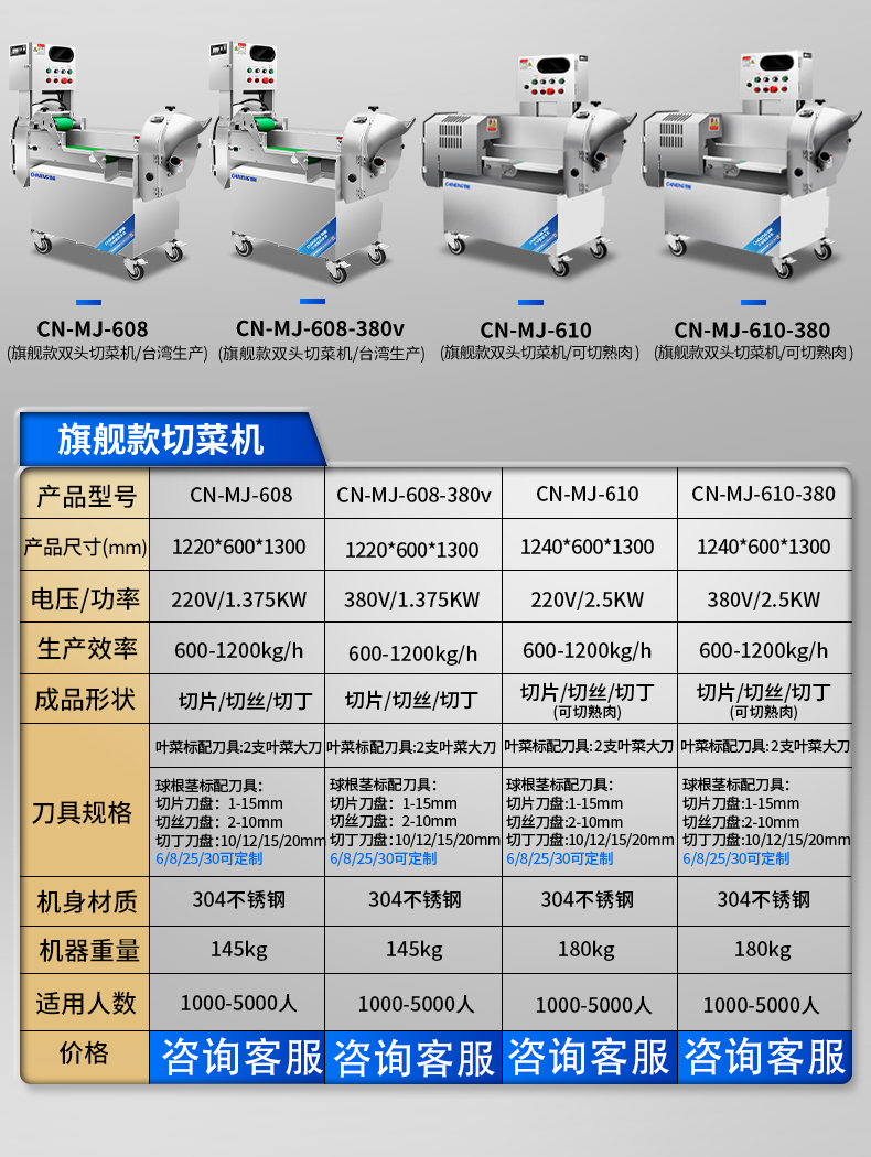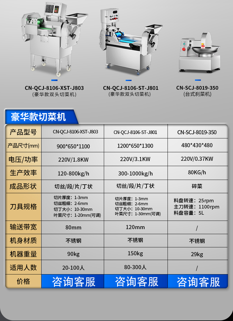 刀具規格:切片尺寸:3mm標配 切絲尺寸:3mm標配 切丁尺寸:12/15/20mm